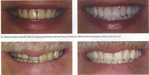 THE SOLUTION: CUSTOM COSMETIC DENTURES Custom cosmetic dentures are the solution. Dr. Berland, Dr. Kong, and Dr. Margolin will design your dentures, and if you choose, implants to specifically fit your face. We can determine the optimum neuromuscular position to place the dentures to improve the physical dimensions of the face, and allow your lips to lay against the teeth properly. By creating a bite where the muscles are most relaxed, your dentures will function better and provide the most facial support. And you will look younger and eat better! If you want to look 10 to 20 years younger, you don’t need a plastic surgeon. You may simply need more expertly designed dentures! If you are in the North Texas area, schedule your consultation with our dental specialists to find out if new cosmetic Custom cosmetic dentures are right for you. Why do people who lose teeth often look so old, so fast?When a person loses all of their teeth and gets a set of dentures, jaw bone has already been lost. Many times the cause for the bone loss is periodontal disease. Periodontal (gum) disease is an infection of the gums and the jawbone. This common and aggressive disease can cause drastic bone loss as well as exacerbate a variety of health problems such as diabetes and cardiovascular issues. Uncontrollable infection can set in, and teeth become loose and must be removed. When the jaw bone melts away as a result of the gum infection, the roots of the teeth no longer have any “soil” to dig into. Gum disease is the number one reason people loose teeth. Even if you don’t have bone loss before you get dentures, bone loss is natural after you get dentures. This is because after teeth are lost, the jaw bone is programmed to disappear. Eventually, you will get a “sunken-in” face. Your chin and your nose will get closer together as your face begins to collapse, aging you rapidly. Custom Cosmetic Dentures help to restore the soft facial tissue and recreate the lost jaw bone. Custom Cosmetic Dentures support the face the same way your natural teeth and bone supported your face many years ago.